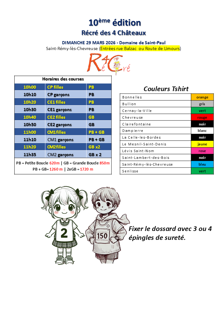 Après le succès retentissant de la dernière édition, où plus d’un millier d’enfants ont pris part à la course, nous avons hâte de vous retrouver pour une nouvelle aventure sportive. La Récré des 4 Châteaux est un événement unique qui permet aux enfants de représenter fièrement leur école et de partager des moments inoubliables.